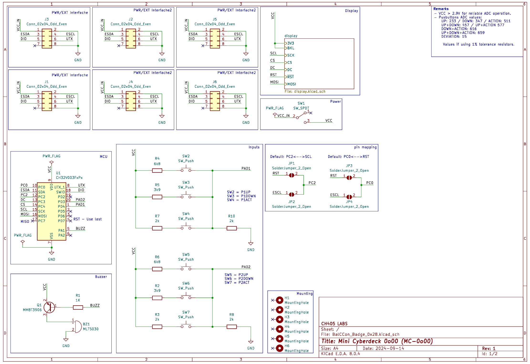 The all new Mini Cyberdeck 0o00 (MC-0o00) is the badge for the BalCCon 2k24 conference. At its heart is the CH32V003 processor. It features an ST7735 lcd display, a piezoelectric buzzer and 6 buttons. It also features an interface for 2.7V to 5.5V power and 4 general purpose input / output (gpio) connections and can be connected to the BalCCon Cyberdeck 0o27 (BCD-0o27).